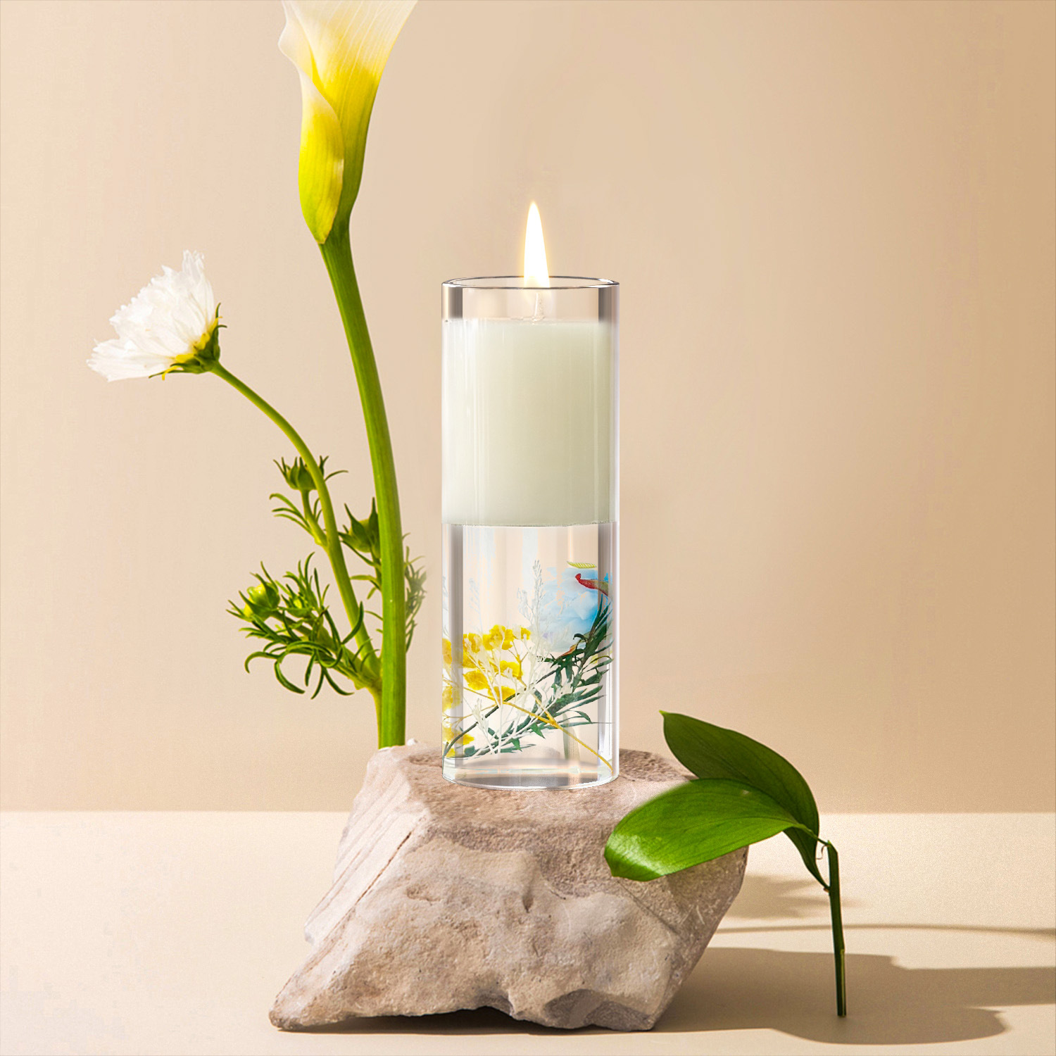 This showstopping candle becomes a decorative conversation piece even when unlit, with its mesmerizing floral suspension and elegant two-tone wax design.